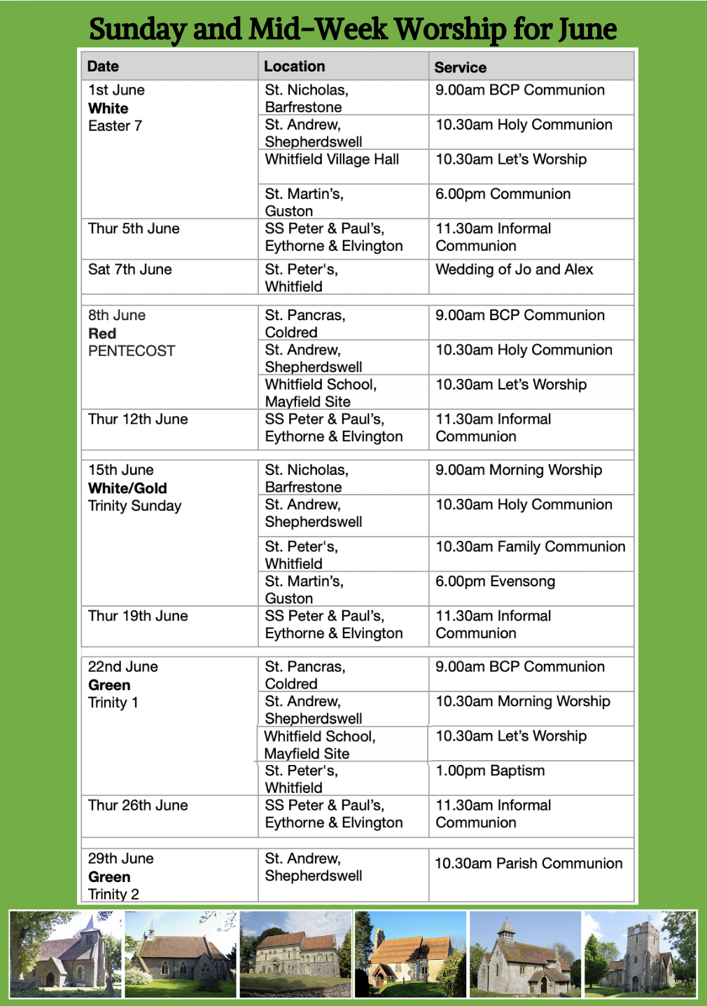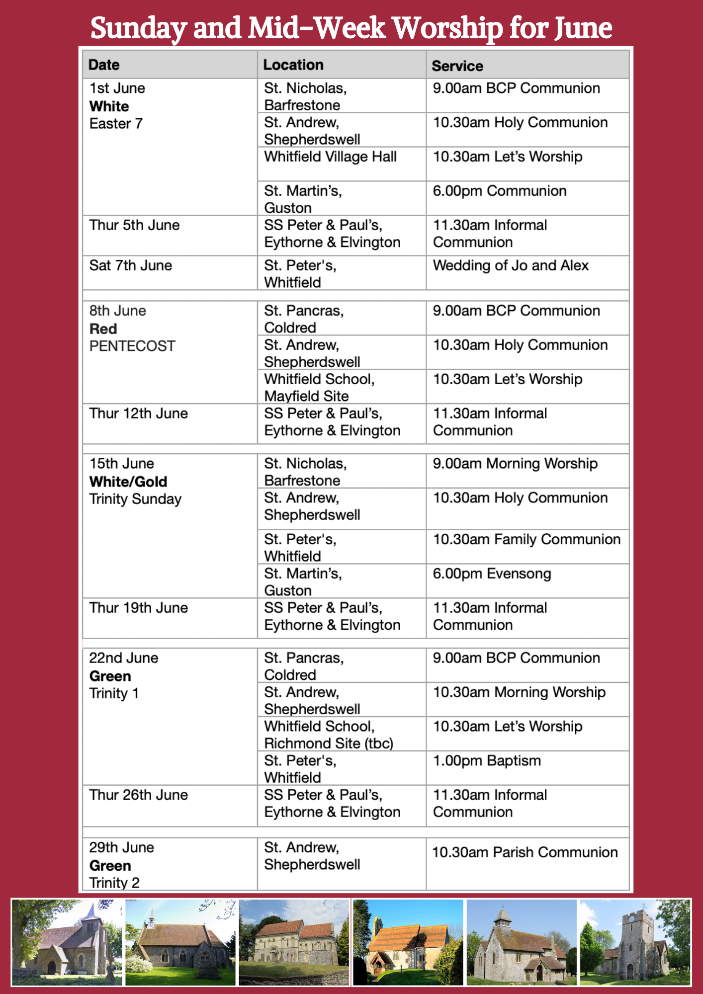 Our CHURCH CALENDAR area on our website, will detail all of our services across the Parish during the week and on Sunday, so please use that page to find out where our services are.